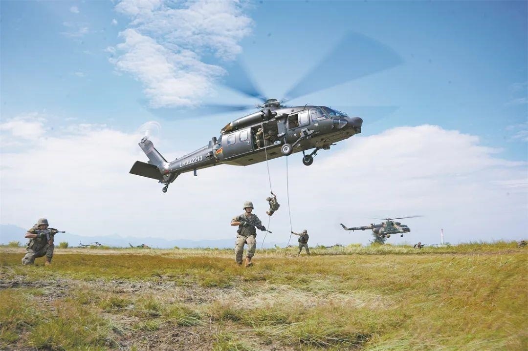 △第72集團(tuán)軍某旅某合成營官兵在陸航部隊配合下開展機(jī)降訓(xùn)練。