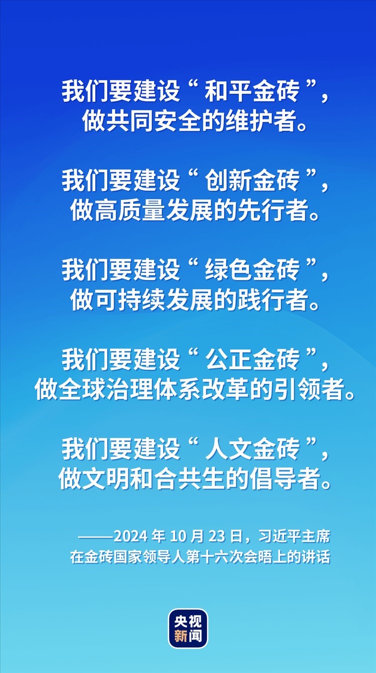 世界越是動蕩,金磚國家越要高舉和平、發(fā)展、合作、共贏旗幟,淬煉金磚成色,展現(xiàn)金磚力量。