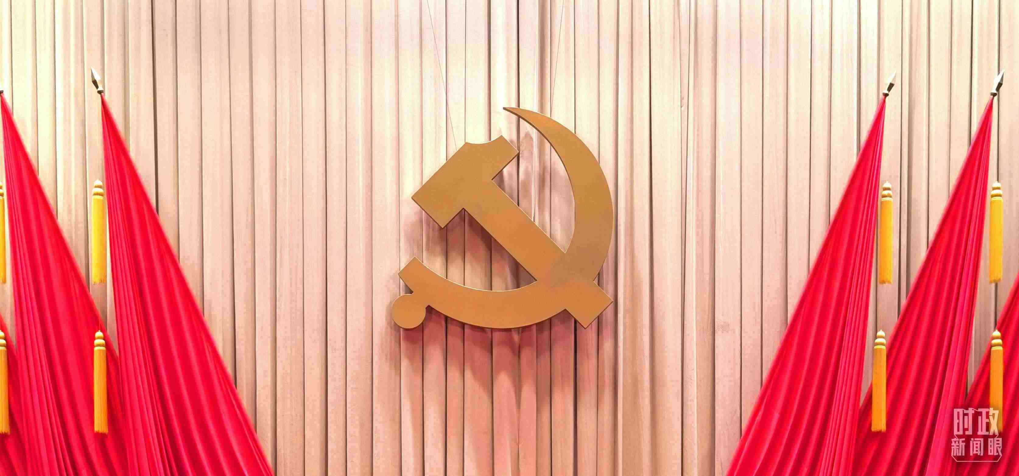 △省部級主要領(lǐng)導(dǎo)干部專題研討班開班式現(xiàn)場懸掛的黨徽。(總臺央視記者郭鴻拍攝)