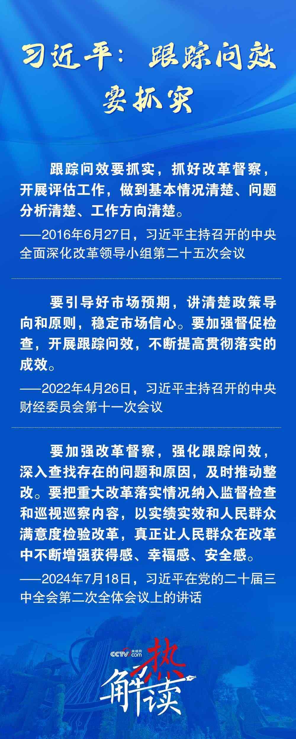 今年7月,在黨的二十屆三中全會(huì)第二次全體會(huì)議上,習(xí)近平總書記進(jìn)一步提出,要強(qiáng)化跟蹤問(wèn)效,深入查找存在的問(wèn)題和原因,及時(shí)推動(dòng)整改。