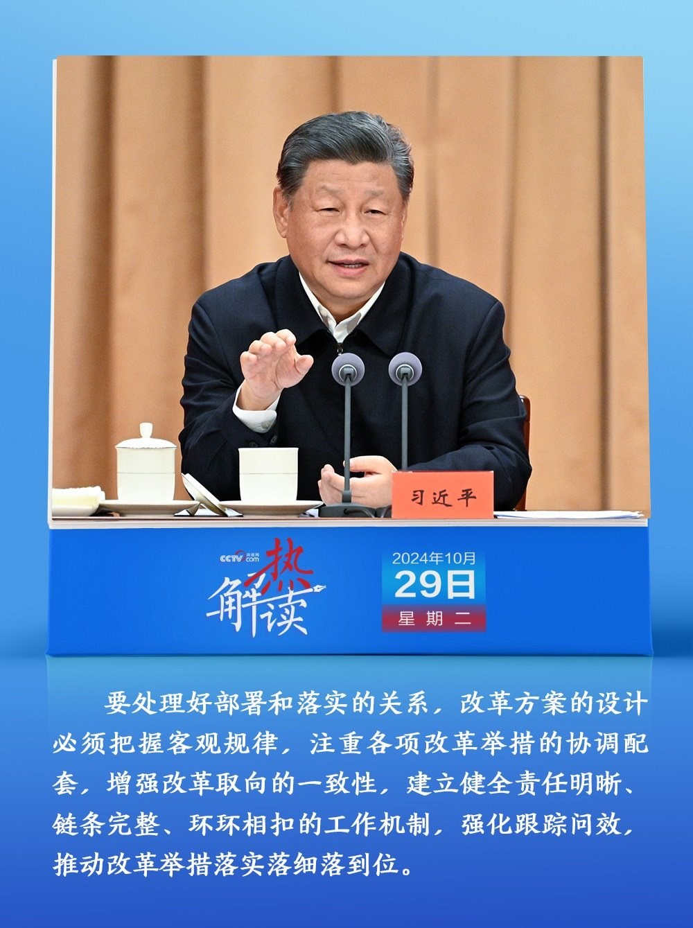 10月29日,省部級(jí)主要領(lǐng)導(dǎo)干部學(xué)習(xí)貫徹黨的二十屆三中全會(huì)精神專題研討班開(kāi)班。在開(kāi)班式上,習(xí)近平總書記明確提出要“處理好部署和落實(shí)的關(guān)系”,“建立健全責(zé)任明晰、鏈條完整、環(huán)環(huán)相扣的工作機(jī)制,強(qiáng)化跟蹤問(wèn)效,推動(dòng)改革舉措落實(shí)落細(xì)落到位”。