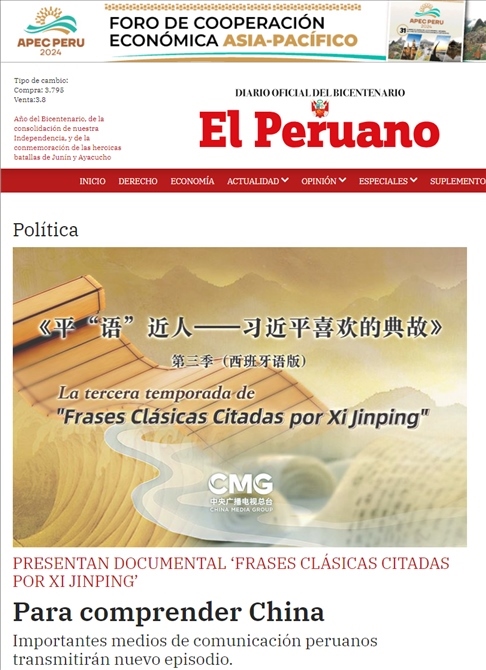 在中國國家主席習(xí)近平應(yīng)秘魯共和國總統(tǒng)博魯阿爾特邀請,赴利馬出席亞太經(jīng)合組織第三十一次領(lǐng)導(dǎo)人非正式會議并對秘魯進行國事訪問之際,由中國中央廣播電視總臺制作的《平“語”近人——習(xí)近平喜歡的典故》第三季(西班牙語版),將于當(dāng)?shù)貢r間11月14日起在秘魯國家廣播電視臺、秘魯電視聯(lián)播網(wǎng)、秘魯廣播節(jié)目集團電視端等多平臺落地播出。當(dāng)?shù)囟嗉抑髁髅襟w對節(jié)目落播進行預(yù)告,引發(fā)秘魯各界普遍期待和廣泛關(guān)注。