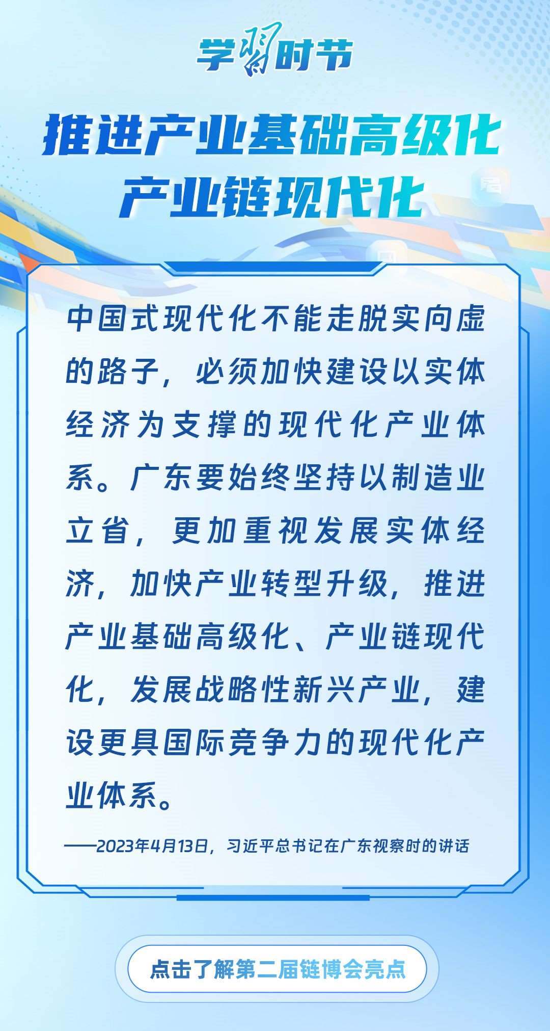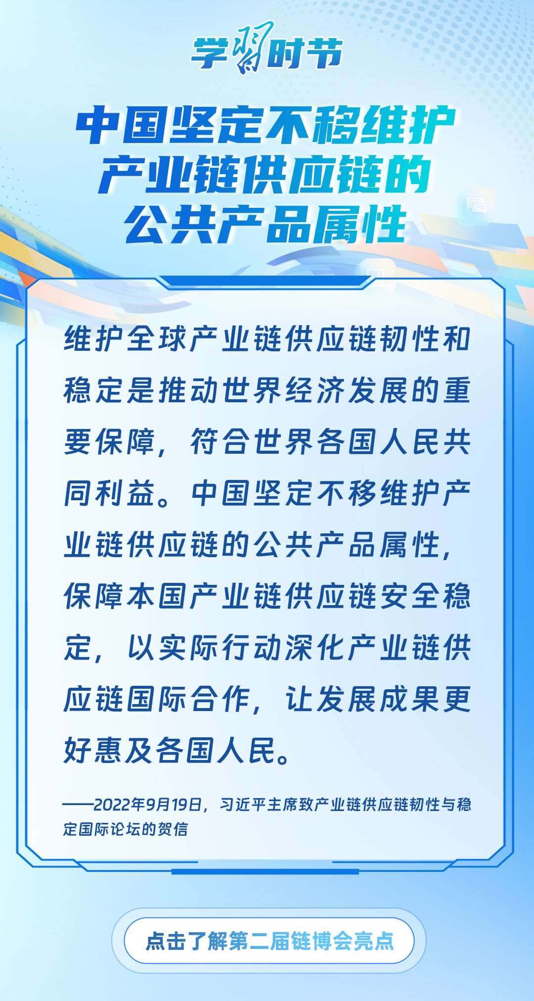 習(xí)近平主席心系產(chǎn)業(yè)鏈供應(yīng)鏈安全穩(wěn)定,多次強調(diào)中國將以實際行動維護全球產(chǎn)業(yè)鏈供應(yīng)鏈安全穩(wěn)定,為世界各國共同構(gòu)筑安全穩(wěn)定、暢通高效、開放包容、互利共贏的全球產(chǎn)業(yè)鏈供應(yīng)鏈體系提供中國方案。習(xí)近平主席曾在多個重要場合對此作出一系列深刻闡述,讓我們一起學(xué)習(xí)。