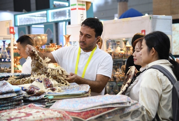 2024年9月20日,在陜西省西安市舉行的第八屆絲綢之路國(guó)際博覽會(huì)上,來(lái)自伊朗的參展商(前左一)向觀眾介紹產(chǎn)品。 新華社記者 張博文 攝