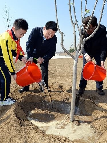 (2014年4月,習近平總書記在團城湖調(diào)節(jié)池參加義務植樹活動)