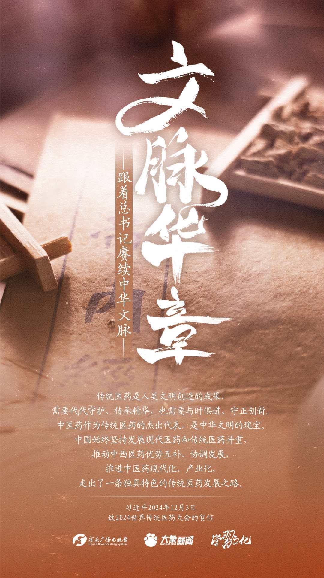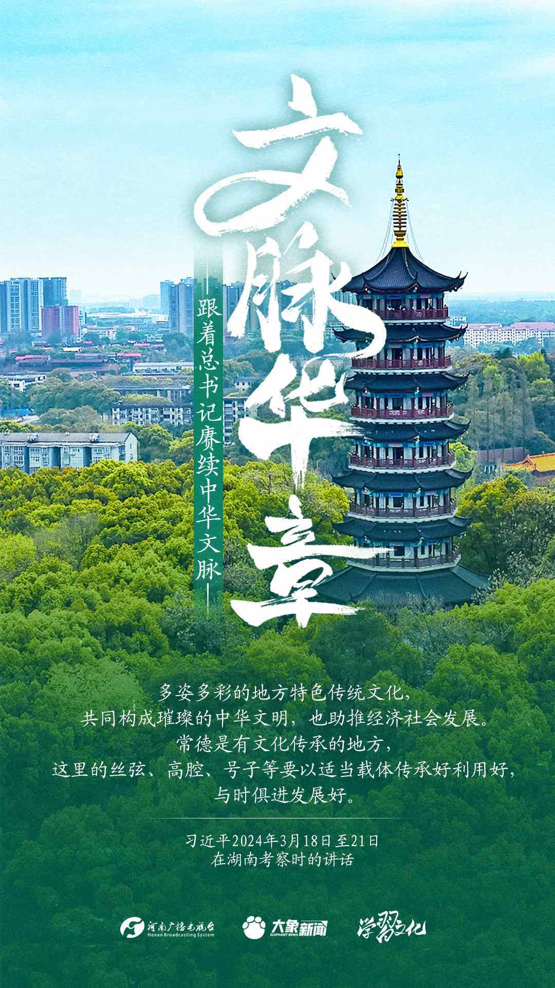 習(xí)近平總書記高度重視中華優(yōu)秀傳統(tǒng)文化的繼承和弘揚(yáng)。2024年,總書記一如既往,念茲在茲。在赴地方考察、主持召開重要會議等眾多場合,多次對傳承發(fā)展中華優(yōu)秀傳統(tǒng)文化作出重要講話重要指示。大象新聞邀您一起,跟著總書記賡續(xù)中華文脈,推動(dòng)中華優(yōu)秀傳統(tǒng)文化創(chuàng)造性轉(zhuǎn)化和創(chuàng)新性發(fā)展,在新的起點(diǎn)上繼續(xù)推動(dòng)文化繁榮、建設(shè)文化強(qiáng)國、建設(shè)中華民族現(xiàn)代文明。
