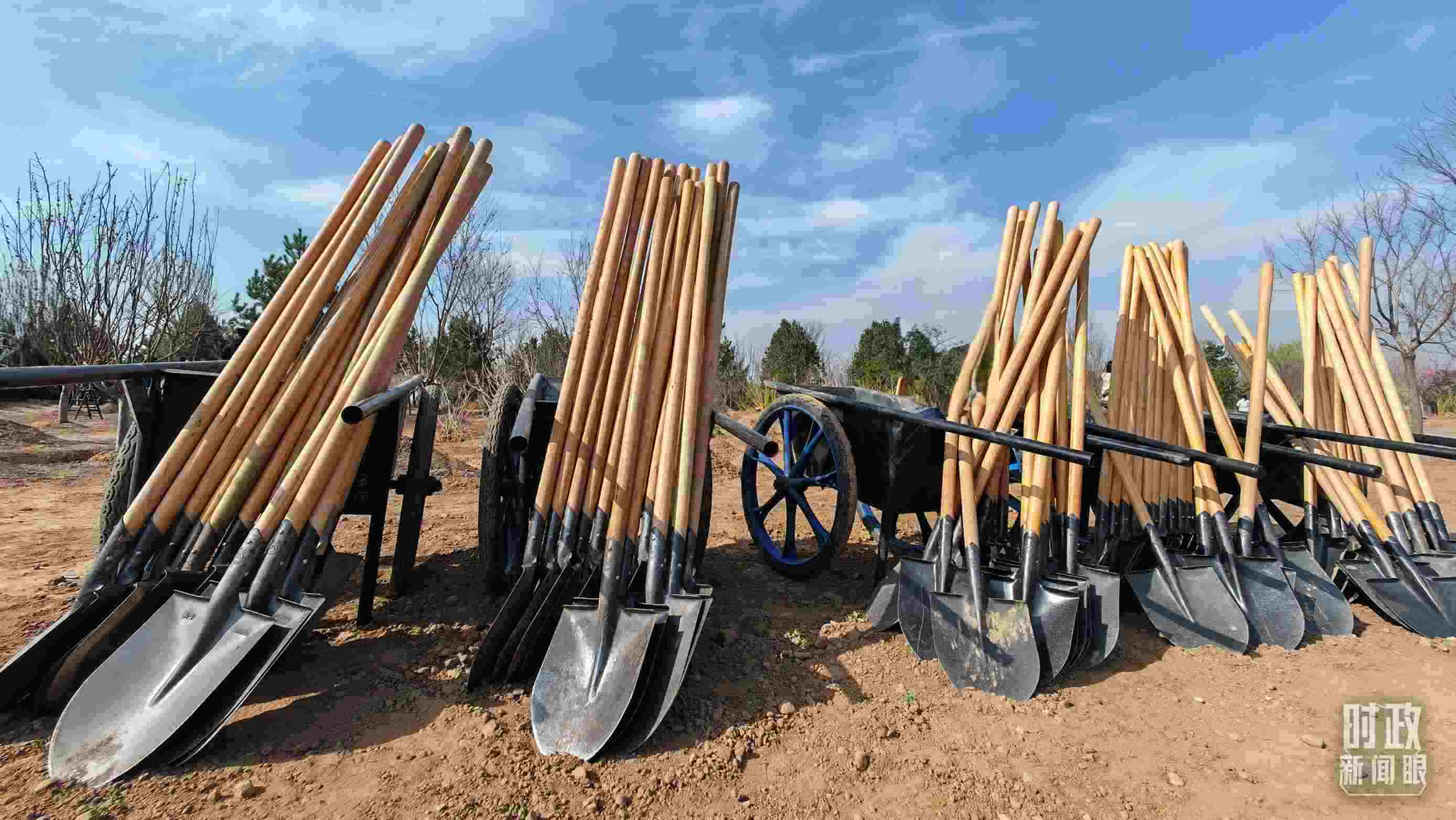 △植樹現場整齊擺放的工具。(總臺央視記者王策拍攝)