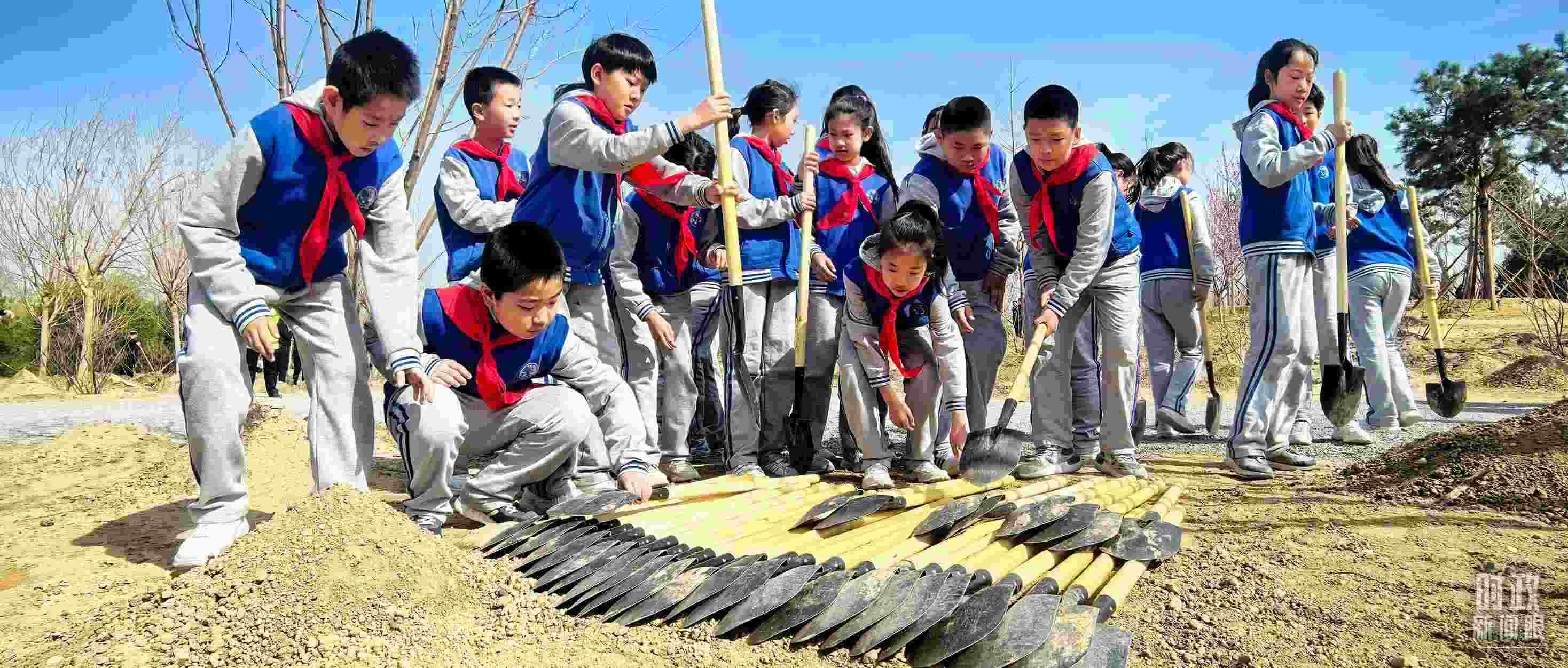 △少先隊員拿起鐵鍬參加義務植樹。(總臺央視記者范凱拍攝)