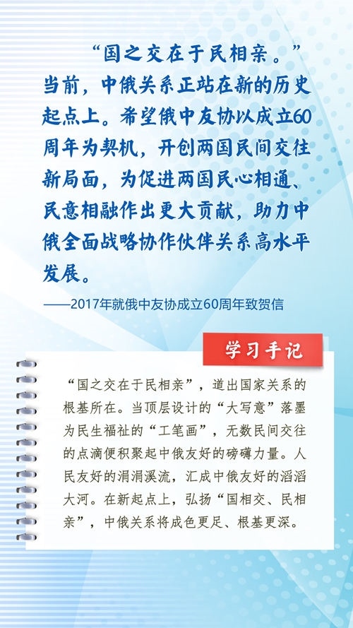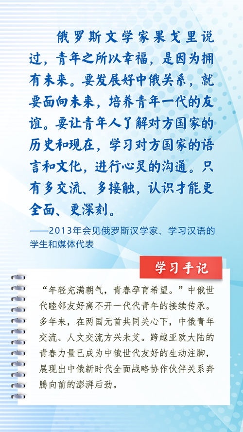 中華民族和俄羅斯民族都有悠久的歷史、古老的文明、燦爛的文化,都是偉大的民族。近年來,習(xí)近平主席常常引用中國(guó)詩詞古語、俄羅斯諺語名言等,寄語中俄關(guān)系發(fā)展和全人類和平與發(fā)展。這些重要論述,蘊(yùn)含對(duì)文明、歷史的深邃思考,指引著新時(shí)代的中俄關(guān)系不斷向前,為世界百年變局中的人類文明進(jìn)步事業(yè)指明方向。