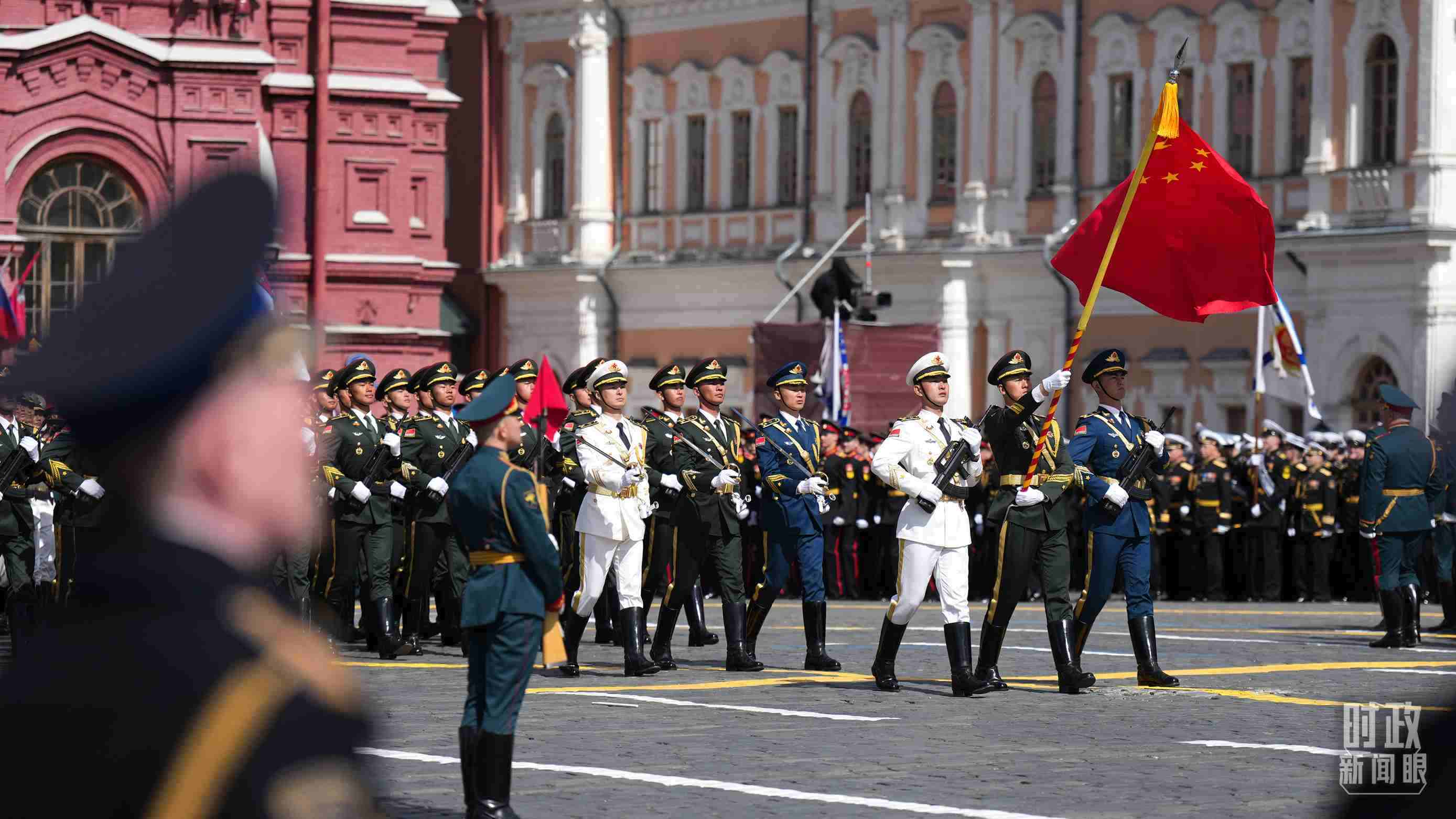 △中國人民解放軍三軍儀仗隊方隊軍容嚴整、士氣高昂,邁著堅定有力的步伐走過紅場。(總臺記者李晉拍攝)
