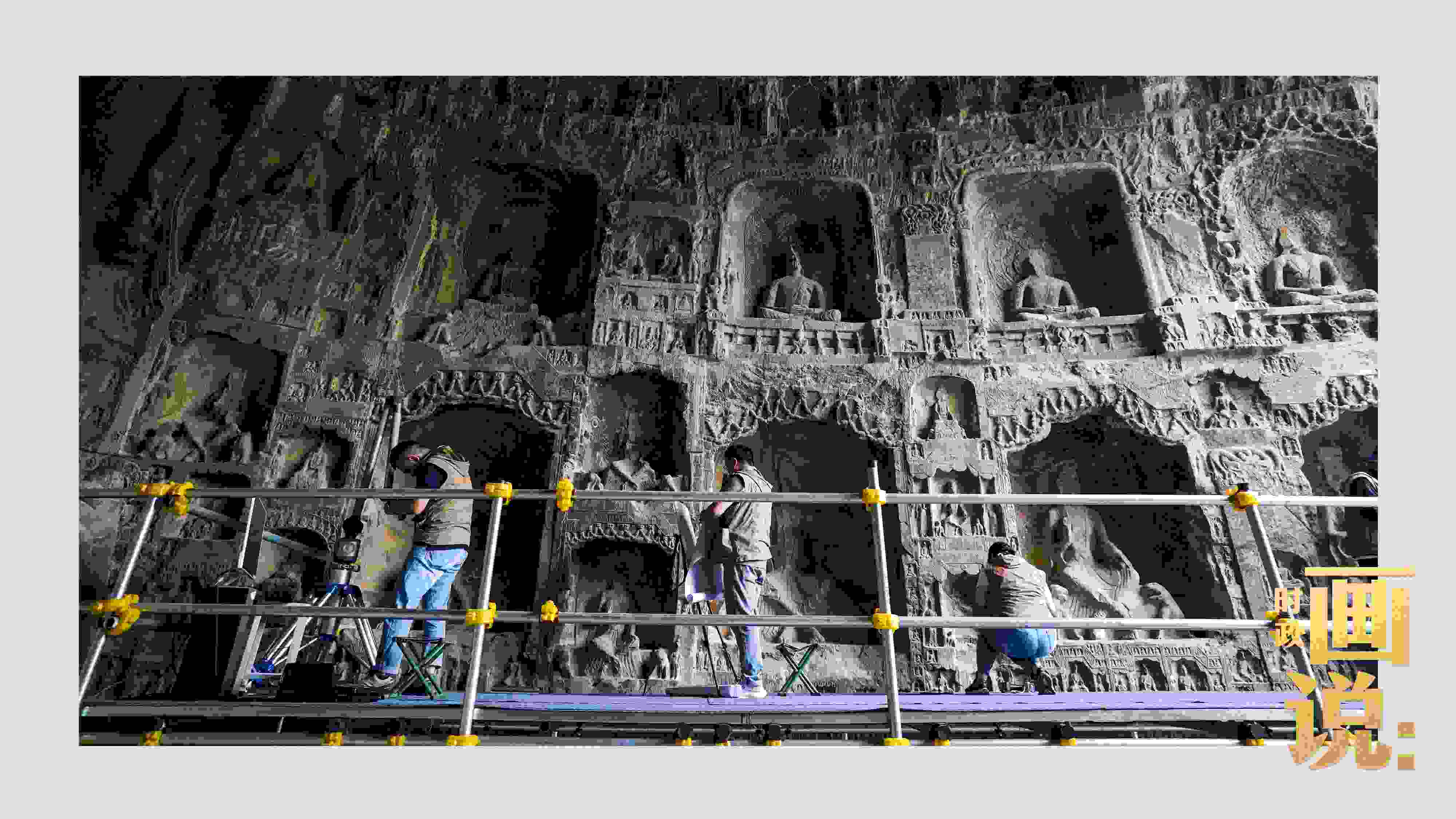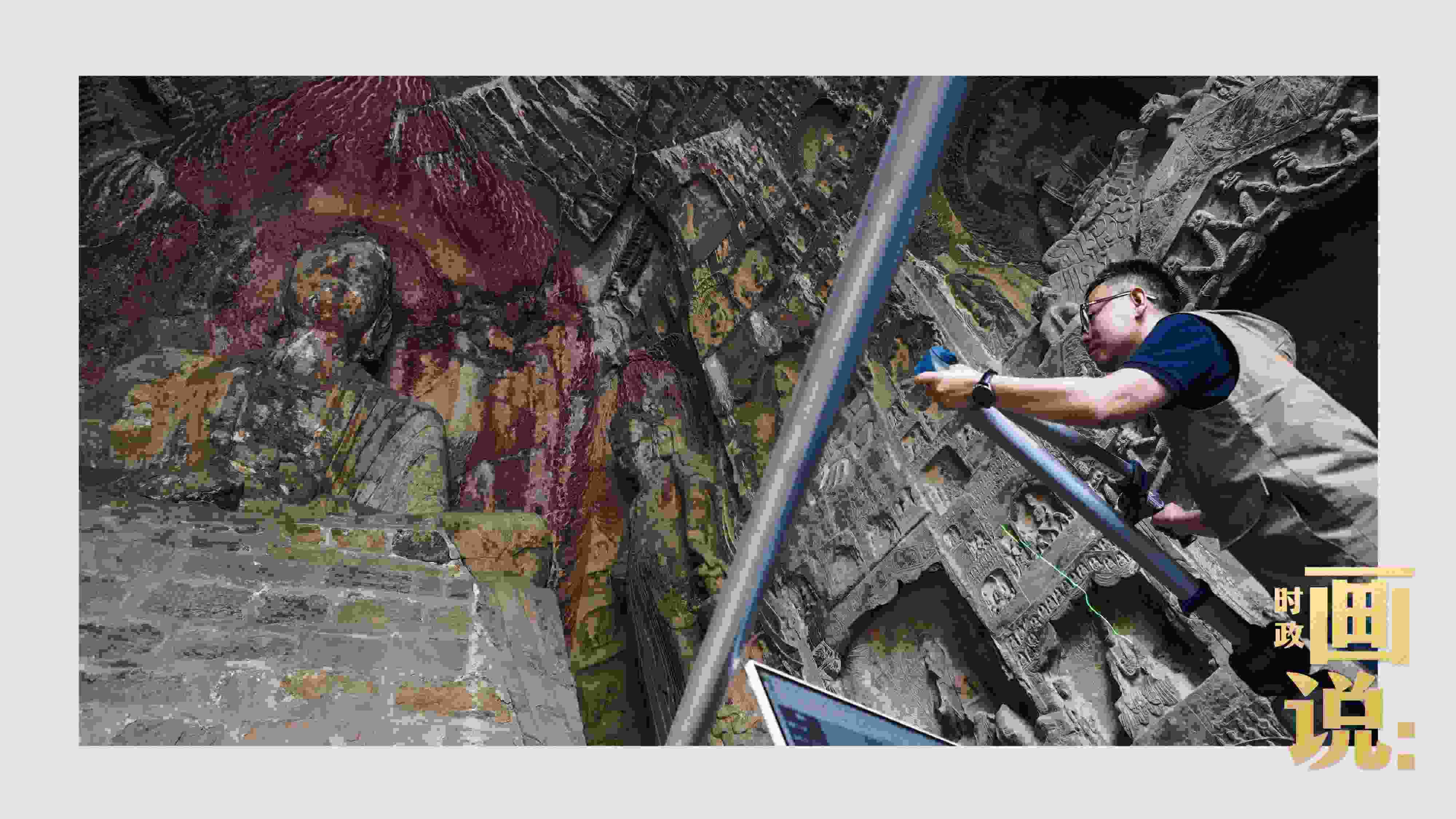 △龍門石窟研究院工作人員在古陽洞使用關節(jié)臂掃描儀對佛像進行數(shù)字化掃描