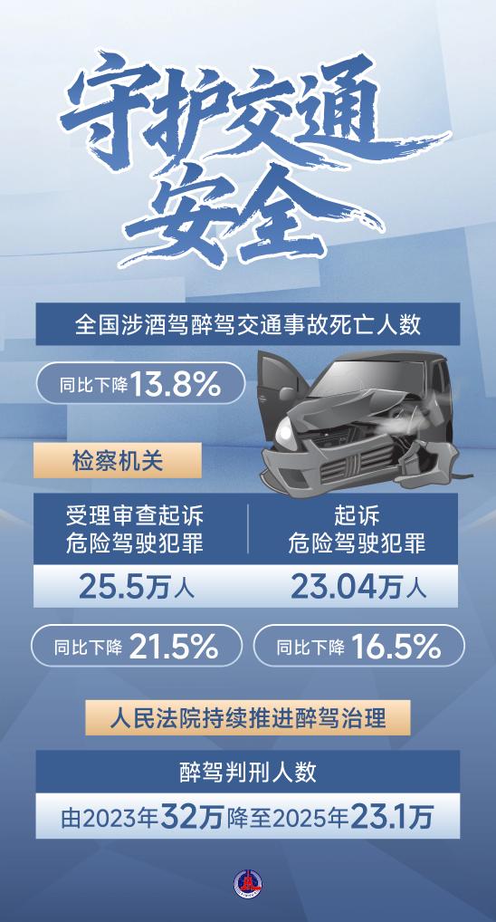 最高法報告指出,辦理醉駕刑事案件意見出臺后,判刑人數(shù)由2023年32萬降至2025年23.1萬,因酒駕造成交通事故及致死、致傷數(shù)量均有下降。同時,明確“駕駛?cè)俗砭坪髥⒂幂o助駕駛功能仍應(yīng)承擔刑事責任”?! ?/p>
