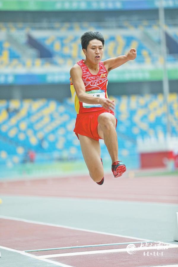 10月25日,內(nèi)蒙古運(yùn)動(dòng)員趙強(qiáng)在跳遠(yuǎn)比賽上奮力一跳。