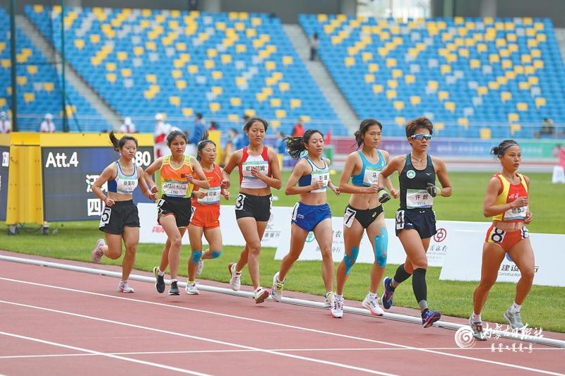 10月23日,內(nèi)蒙古運(yùn)動(dòng)員姜迎弟(左三)在女子萬米聽障比賽中與各路高手角逐。