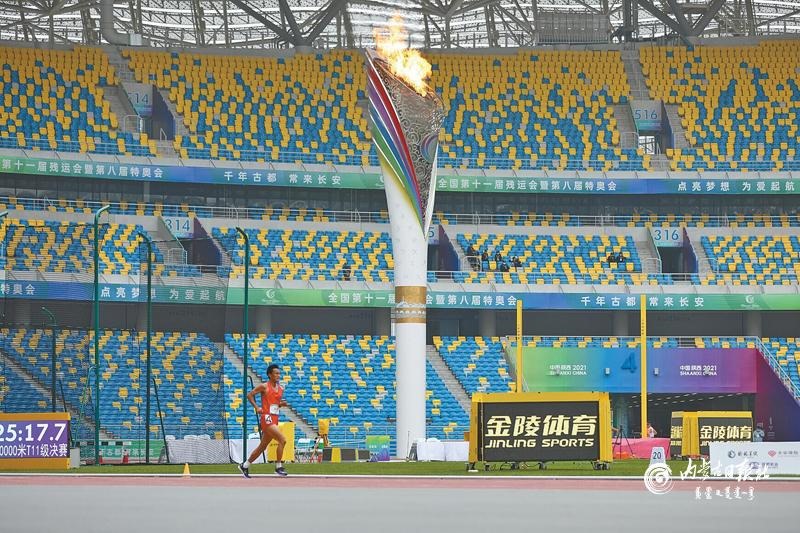 10 月23 日,男子t11 級10000米的賽場上,內(nèi)蒙古運(yùn)動(dòng)員孟可在沒有領(lǐng)跑員的不利條件下,依然堅(jiān)持跑完了全程。