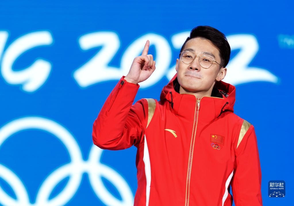 2月8日,冠軍中國隊選手任子威在獎牌頒發(fā)儀式上。