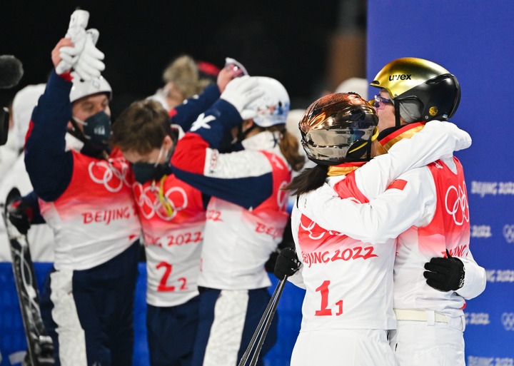 2月10日,賈宗洋(右)與徐夢(mèng)桃賽后擁抱,美國(guó)隊(duì)在他們身后慶祝奪冠。新華社記者朱崢攝