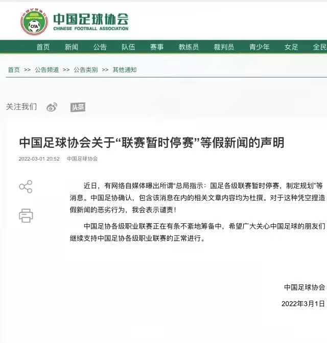 “近日,有網(wǎng)絡自媒體曝出所謂‘(體育)總局指示:國足各級聯(lián)賽暫時停賽,制定規(guī)劃’等消息。中國足協(xié)確認,包含該消息在內(nèi)的相關(guān)文章內(nèi)容均為杜撰。對于這種憑空捏造假新聞的惡劣行為,我會表示譴責!”中國足協(xié)在聲明中說。