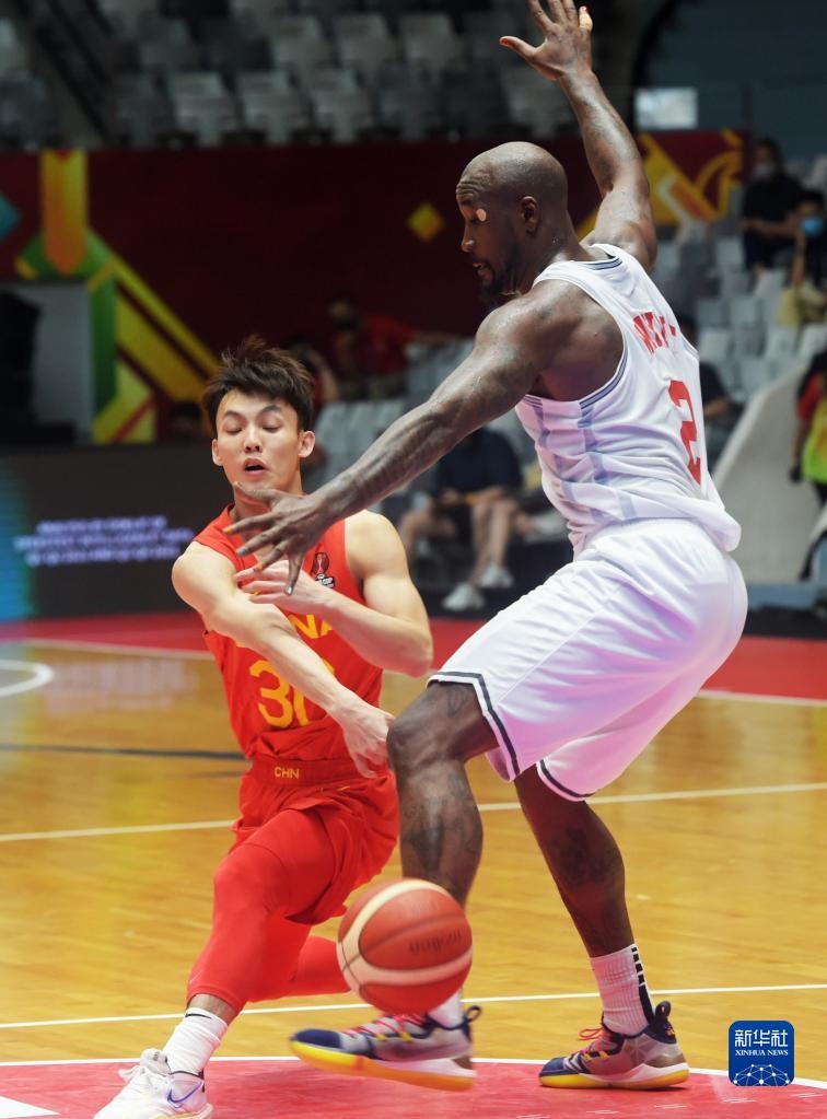 7月14日,中國(guó)隊(duì)球員王哲林(前中)在比賽中拼搶。新華社發(fā)(祖卡南攝)