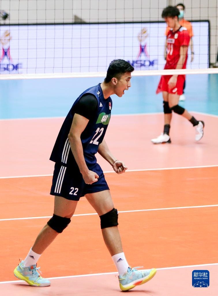 8月14日,中國隊球員張景胤(右一)在比賽中扣球。新華社記者 王騰 攝