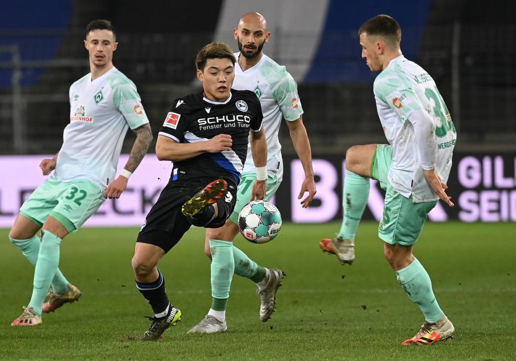 2021年3月10日,當時效力于比勒菲爾德隊的日本球員堂安律(前左)在德甲比賽中帶球突破。他現(xiàn)在效力于德甲弗賴堡俱樂部。新華社發(fā)(烏爾里希·胡夫納格爾 攝)