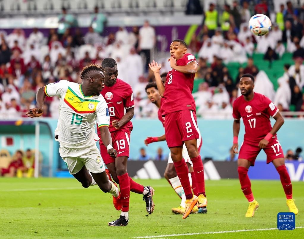 11月25日,塞內(nèi)加爾隊(duì)球員迪德希歐(左一)頭球破門,取得球隊(duì)第二粒進(jìn)球。新華社記者 丁旭 攝