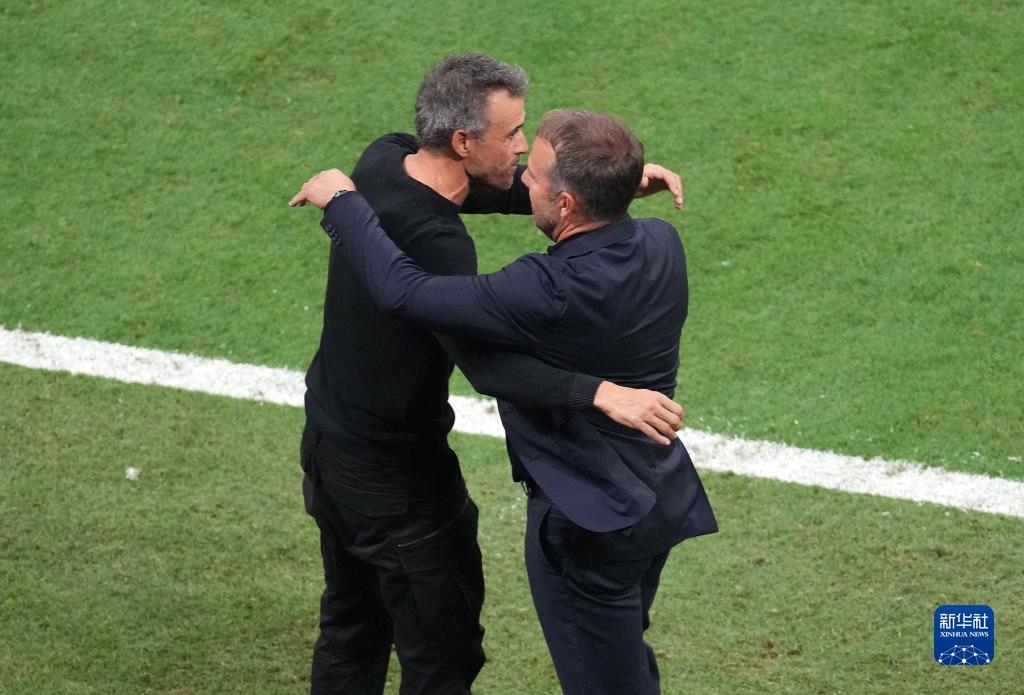 11月27日,德國隊主教練漢斯·弗利克(右)與西班牙隊主教練路易斯·恩里克在比賽后相互致意。新華社記者 陳誠 攝