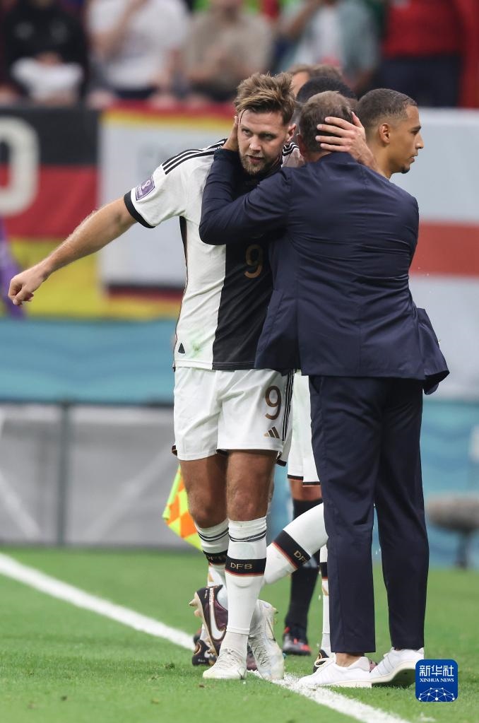 11月27日,德國隊球員尼克拉斯·菲爾克魯格(左)在比賽中進球后與主教練漢斯·弗利克慶祝。新華社記者 曹燦 攝