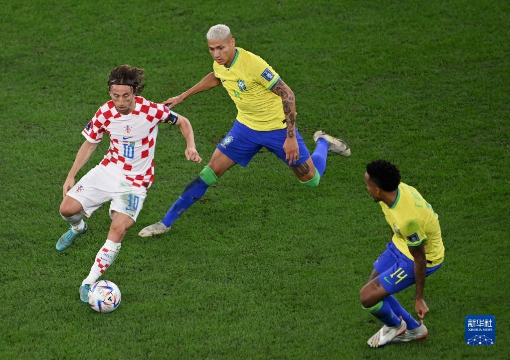 12月9日,克羅地亞隊(duì)球員莫德里奇(左)與巴西隊(duì)球員理查利森(中)、米利唐在比賽中拼搶。新華社記者 夏一方 攝