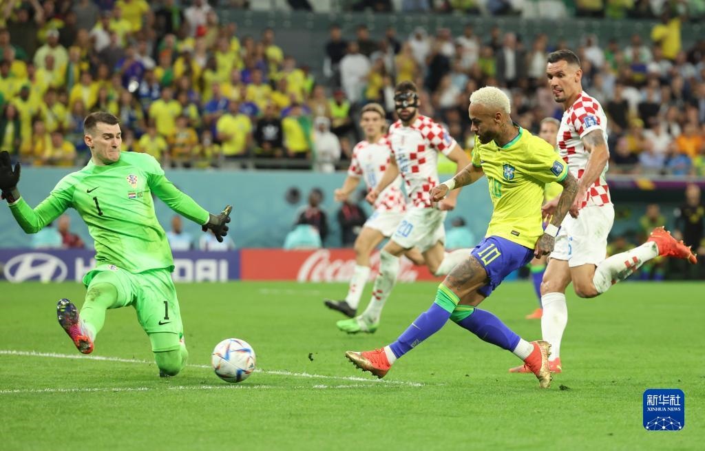 12月9日,巴西隊(duì)球員內(nèi)馬爾(右二)在比賽中突破克羅地亞隊(duì)守門員利瓦科維奇(右三)的防守后射門得分。新華社記者 蘭紅光 攝