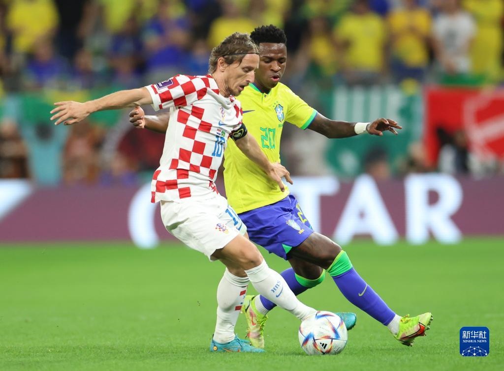 12月9日,克羅地亞隊(duì)球員莫德里奇(左)與巴西隊(duì)球員維尼修斯在比賽中拼搶。新華社記者 李明 攝