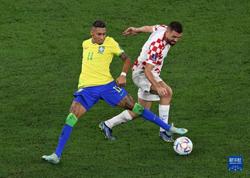 12月9日,巴西隊(duì)球員拉菲尼亞(左)與克羅地亞隊(duì)球員科瓦契奇在比賽中拼搶。新華社記者 夏一方 攝