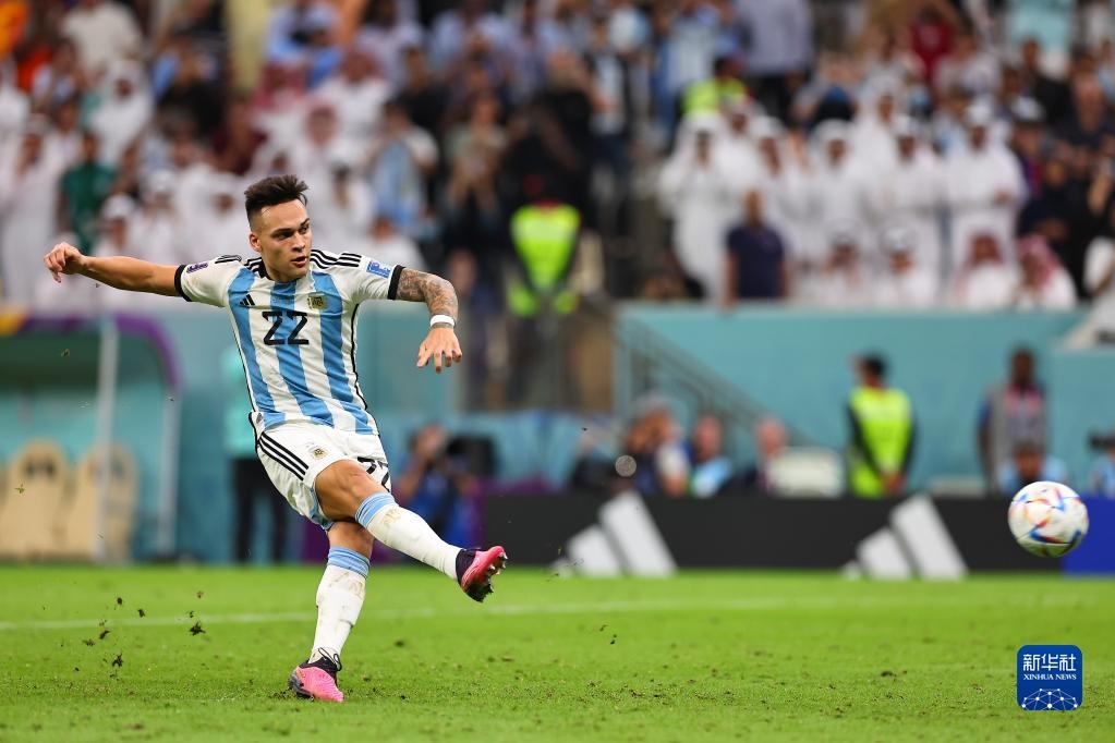 12月9日,阿根廷隊(duì)球員勞塔羅·馬丁內(nèi)斯在點(diǎn)球大戰(zhàn)中主罰點(diǎn)球得分。