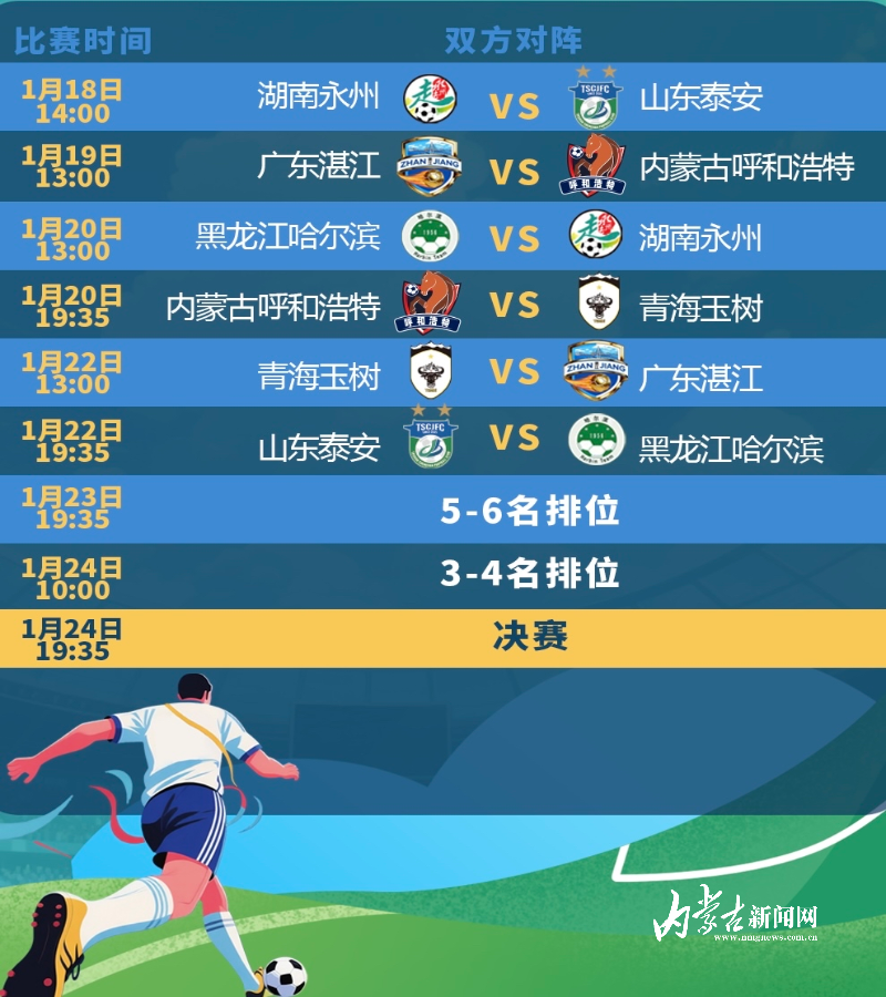 群眾足球風云再起,一場匯聚南北、融合競技與文化的群眾足球盛宴即將激情上演。1月18日至1月24日,CMG群眾足球邀請賽將在湖南省永州市拉開帷幕。1月11日晚,抽簽結果正式揭曉,呼和浩特隊將于1月19日首戰(zhàn)粵超冠軍廣東湛江隊。球隊將于1月16日啟程,在永州進行合練。