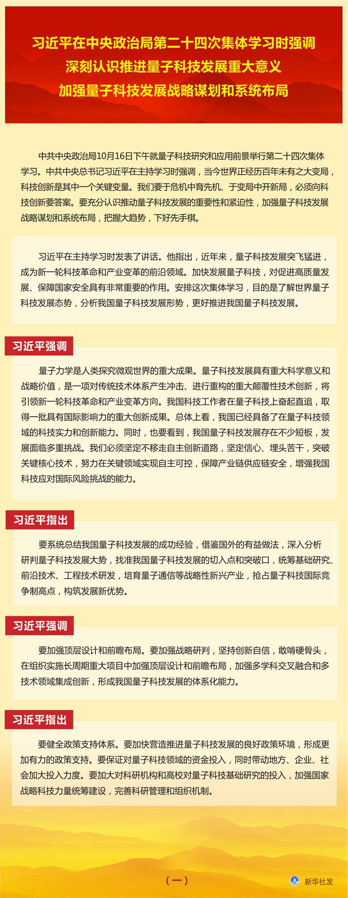 習(xí)近平在主持學(xué)習(xí)時(shí)發(fā)表了講話。他指出,近年來(lái),量子科技發(fā)展突飛猛進(jìn),成為新一輪科技革命和產(chǎn)業(yè)變革的前沿領(lǐng)域。加快發(fā)展量子科技,對(duì)促進(jìn)高質(zhì)量發(fā)展、保障國(guó)家安全具有非常重要的作用。安排這次集體學(xué)習(xí),目的是了解世界量子科技發(fā)展態(tài)勢(shì),分析我國(guó)量子科技發(fā)展形勢(shì),更好推進(jìn)我國(guó)量子科技發(fā)展。