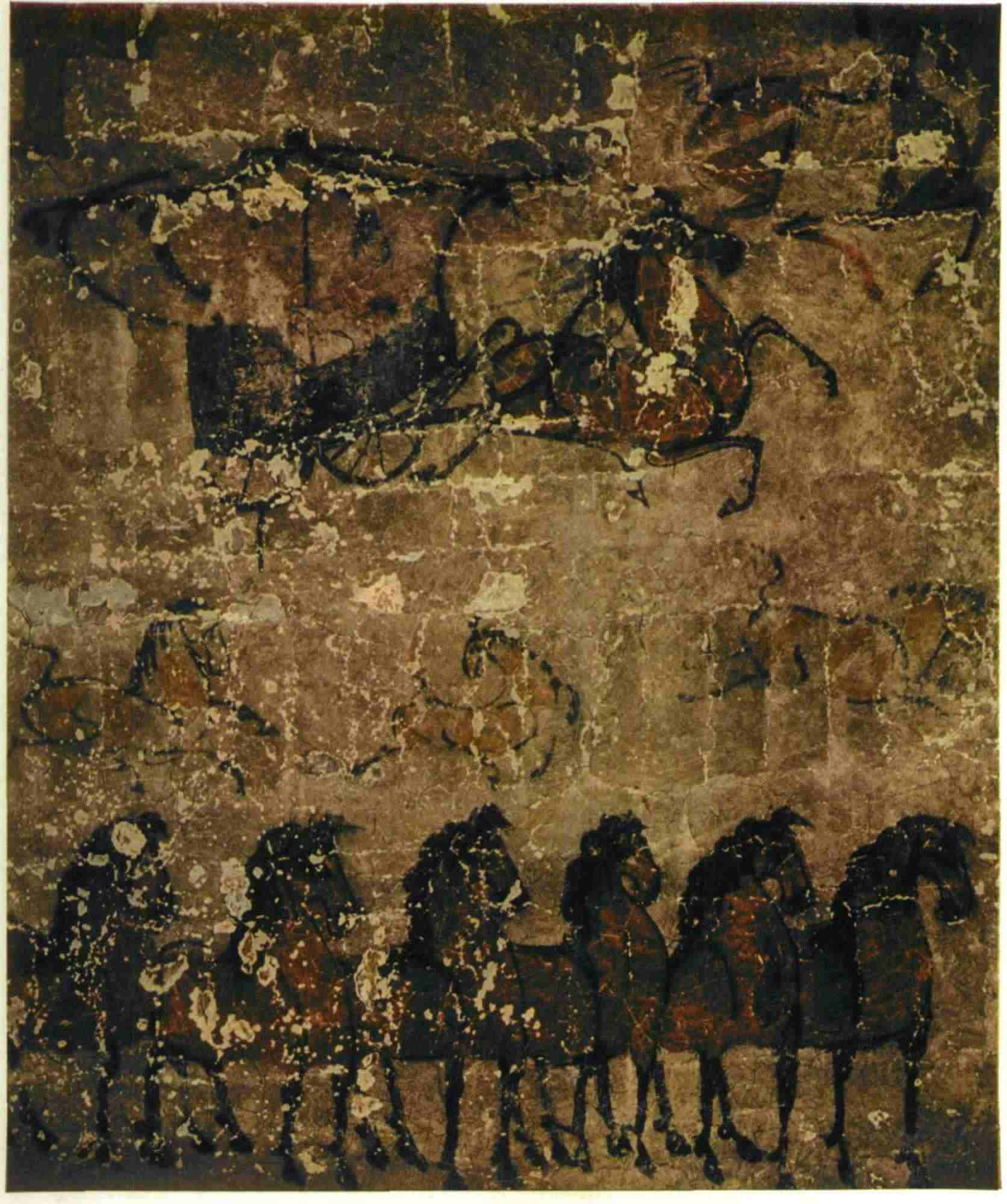 壁畫分上、中、下3層:中層畫墓主人生前的官宦事跡,下層畫他的下屬官曹,頂郁畫靈異等神話傳說(shuō)。