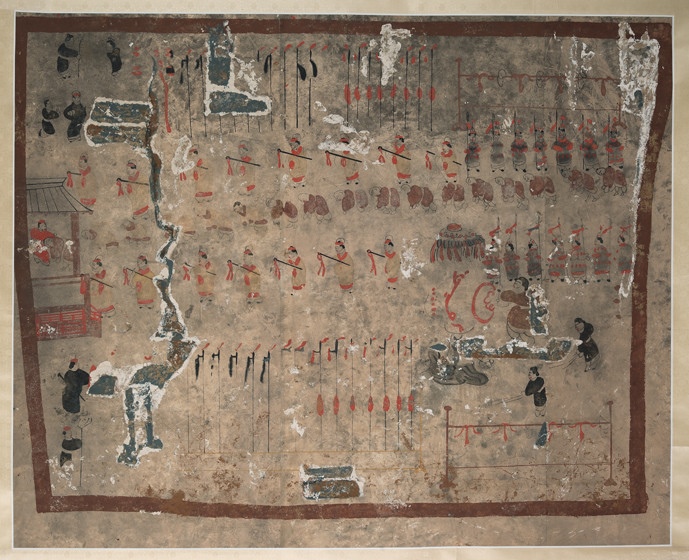 再繞回前室中層,橫跨東北西3面墓壁即是《護(hù)烏桓校尉出行圖》。墓主人所乘軺車,駕3匹黑馬,榜題“使持節(jié)護(hù)烏桓校尉”等字,主車前后有鼓車、斧車,層層環(huán)護(hù)眾多武官、兵丁,隨從有“別駕從事”“功曹從事”“校尉行部”等下屬官職,連車列騎,旗旌飄揚(yáng),場(chǎng)面極為壯觀。中室東壁下半部描繪的是《寧城圖》與《護(hù)烏桓校尉幕府圖》?!秾幊菆D》畫有城垣、城門、衙署等內(nèi)容,其中寧城南門外武士持戟列隊(duì)、身著胡服的少數(shù)民族人物徐徐入內(nèi)的場(chǎng)景最為突出。占據(jù)主畫面的是《護(hù)烏桓校尉幕府圖》,由于任護(hù)烏桓校尉官職是墓主人一生中最值得炫耀的經(jīng)歷,所以,此圖描繪得最為詳細(xì)夸張,是整個(gè)壁畫中的核心部分。整個(gè)幕府分為堂院、營(yíng)舍和庖舍3個(gè)部分,堂屋為高大的廡殿式房屋,墓主人端坐堂上,堂下藝人在表演樂(lè)舞雜耍,少數(shù)民族人物伏拜覲見,周圍環(huán)立官吏武士,場(chǎng)面喧囂隆重。營(yíng)舍位于幕府后院,是幕府中管理軍務(wù)的機(jī)構(gòu)所在,庖舍位于幕府的西南角,掌管幕府廚飲之事。