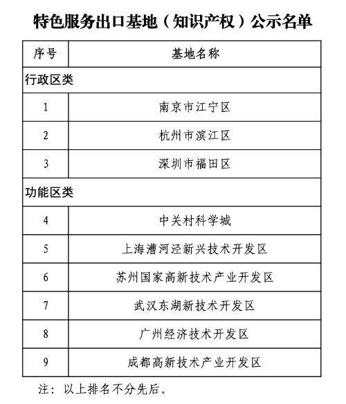 據(jù)國家知識產權局官網消息,根據(jù)《商務部等7部門辦公廳(室)關于組織申報專業(yè)類特色服務出口基地的通知》(商辦服貿函〔2021〕355號)要求,經地方申報、省市知識產權和商務主管部門初審推薦、第三方機構客觀指標評審、專家評審、部門工作組復核等程序,初步認定知識產權服務出口基地9家,名單于2月7日-2月11日進行公示。