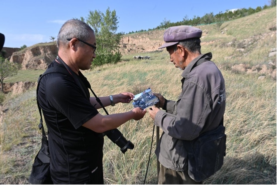鏡頭見(jiàn)證滄桑,筆尖記錄百姓。這些年,只要疫情緩解,長(zhǎng)城人沒(méi)有停下腳步,而是一次又一次去看長(zhǎng)城、看邊堡、看邊墻下的鄉(xiāng)親們。車靜靜地行駛在空曠、蒼涼的長(zhǎng)城腳下,76歲的牧羊人呂三良正在長(zhǎng)城邊牧羊。2022年5月24日,呼和浩特市長(zhǎng)城科普學(xué)會(huì)會(huì)員追隨牧羊人的腳步,把照片送到呂三良手中,看著老人端詳著照片里的自己,會(huì)員們特別滿足。這,難道就不是一個(gè)攝影人的長(zhǎng)城情懷、百姓情懷嗎?(郭雁平 高曉梅)