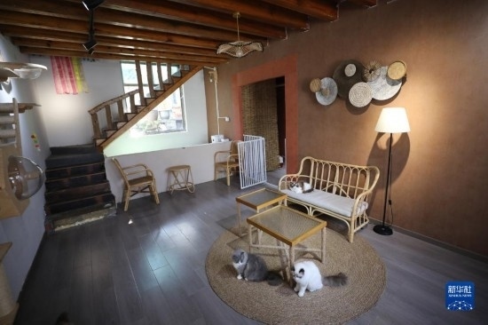 5月23日在浙江省義烏市李祖村拍攝的貓咖“貓的小院”內(nèi)景。