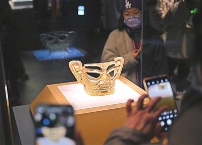 2月15日,上海博物館東館,觀眾參觀“星耀中國:三星堆·金沙古蜀文明展”上的金面具。新華社記者 劉 穎攝