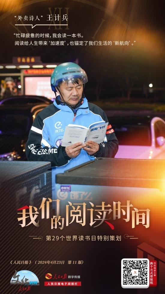 “我的外賣箱里總會(huì)放一本書,在等外賣的間隙或者訂單空閑的時(shí)候看,現(xiàn)在主要在手機(jī)上閱讀?!比缃?,王計(jì)兵已創(chuàng)作5000多首詩歌,出版3本詩集,還在進(jìn)行非虛構(gòu)寫作。他說:“閱讀給我的人生帶來‘加速度’,為忙碌的生活錨定方向感?!?/p>