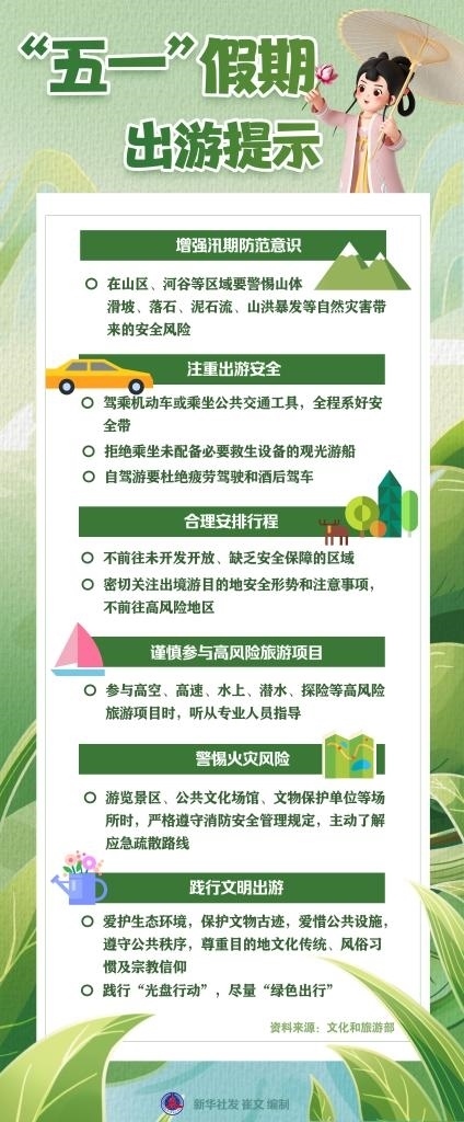 文化和旅游部近日發(fā)布“五一”假期出游提示,提醒廣大游客增強(qiáng)汛期防范意識、注重出游安全、合理安排行程、謹(jǐn)慎參與高風(fēng)險旅游項目、警惕火災(zāi)風(fēng)險、踐行文明出游。