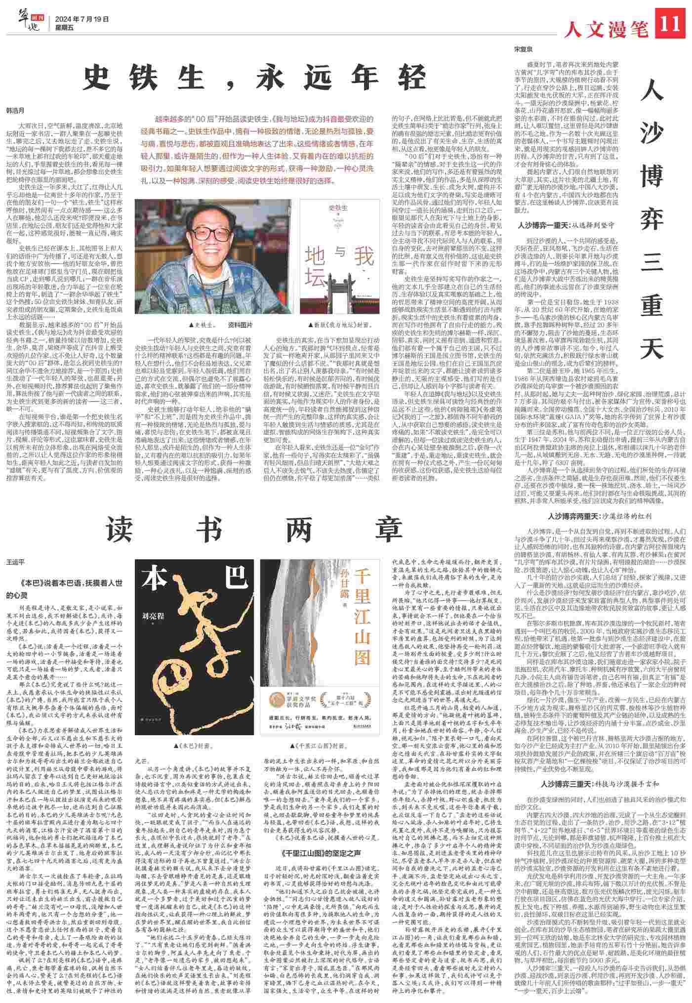 到過沙漠的人,一個共同的感受是,天際蒼茫,狂風怒吼,飛沙走石。生活在沙漠邊緣的人,則要長年累月地與沙漠搏斗,打的是一場維護家園的保衛(wèi)戰(zhàn)。在這場戰(zhàn)爭中,內(nèi)蒙古有三個關(guān)鍵人物,他們是人沙博弈大戰(zhàn)中苦練出來的精英模范,他們的事跡永遠留在了沙漠變綠洲的傳說中。