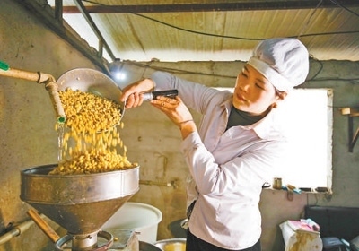 貴州省貴陽市修文縣久長鎮(zhèn)孟沖村一家豆腐加工作坊,工作人員將大豆舀入打漿機加工。周訓(xùn)超攝(人民視覺)