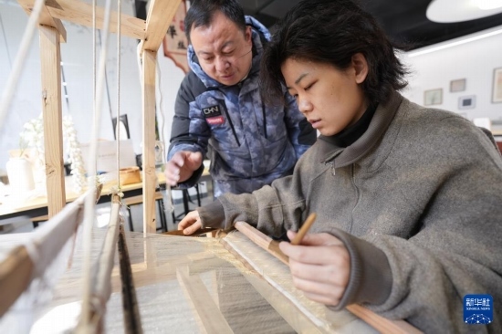 2月19日,柯翔祥(左)在德清莫干山鎮(zhèn)由蠶種場改造的絲綢技藝展示館給從西安前來研學(xué)的大學(xué)生介紹緙絲技術(shù)。