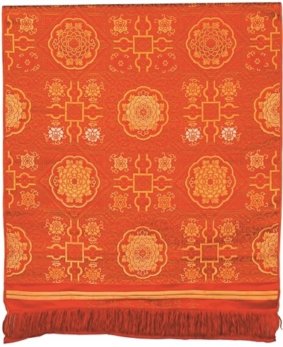 宋錦主產(chǎn)地為蘇州,與云錦、蜀錦并稱為中國古代三大名錦。宋錦采用經(jīng)線緯線聯(lián)合顯花的組織結構和彩拋換色工藝,風格古樸典雅,在古代多用于書畫裝裱,有著獨特的藝術魅力。清代紅地如意牡丹紋天華錦為宮廷用宋式錦,紅緞地上以彩色絲線和金線作緯顯花,圖案基本骨架為典型的宋錦紋樣——“米”字狀八達暈式樣,飾有牡丹、蓮花、如意紋等,寓意富貴安康、吉祥如意。