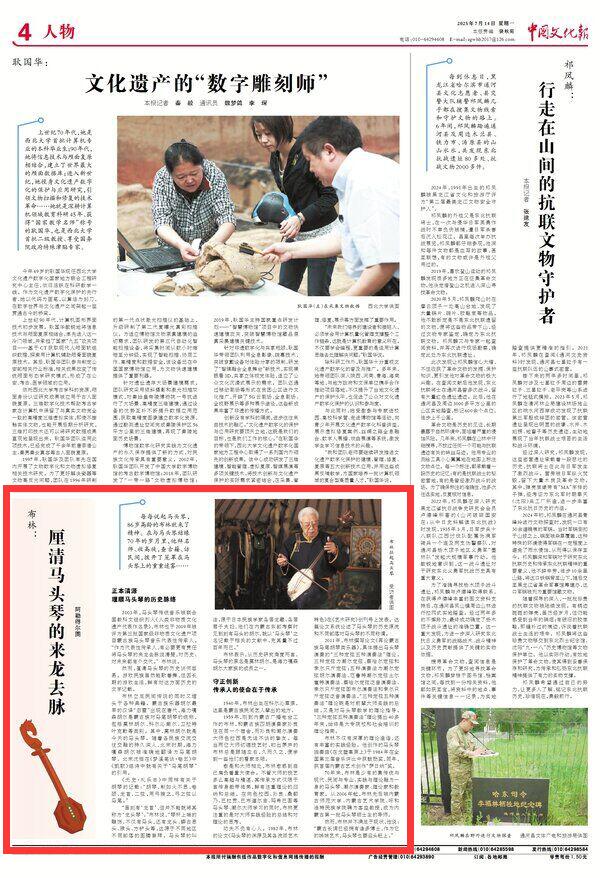 2025年7月14日《中國文化報(bào)》第4版刊發(fā)了題為《布林:厘清馬頭琴的來龍去脈》的文章,報(bào)道了做為非物質(zhì)文化遺產(chǎn)項(xiàng)目蒙古族馬頭琴音樂代表性傳承人的布林立足民間傳說的同時(shí)又埋頭于各種典籍。他說作為代表性傳承人,有必要更有責(zé)任將馬頭琴的來龍去脈說清楚,對歷史、對未來都有個(gè)交代。