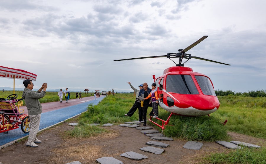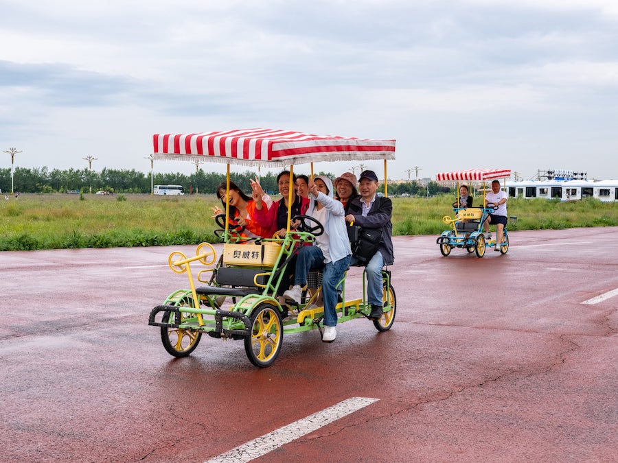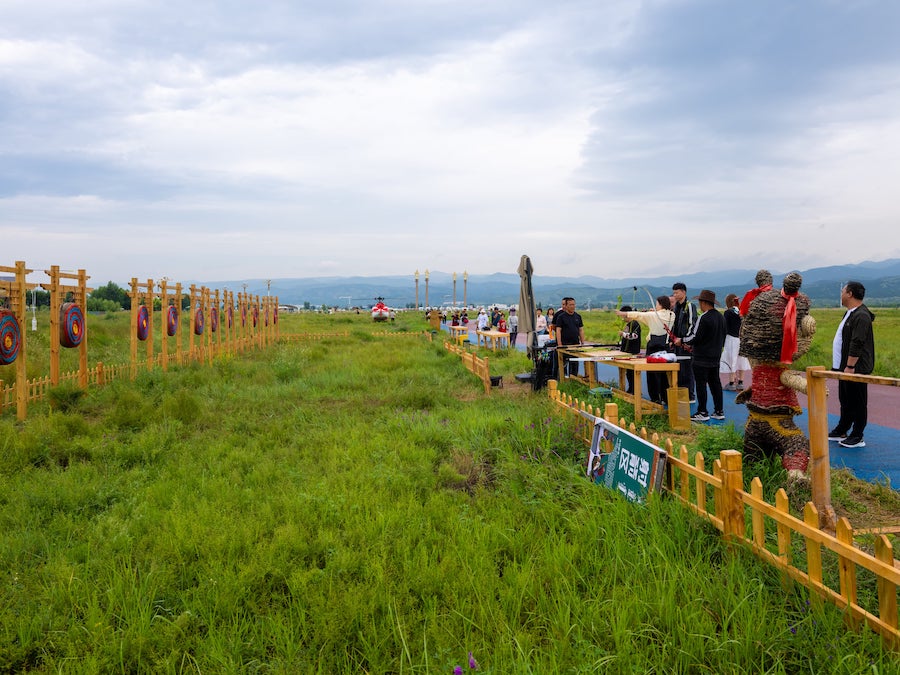 來(lái)自全國(guó)各地的游客踏過(guò)浸潤(rùn)雨水的青草,在這片土地上尋覓多樣樂(lè)趣:身著盛裝的游客倚著氈房淺笑,鏡頭將服飾的明艷與草原的蒼綠定格成畫(huà);射箭場(chǎng)上,游客拉弓瞄準(zhǔn)的瞬間,風(fēng)聲與周遭歡呼交織成趣;草原觀光小火車(chē)緩緩穿行,濕潤(rùn)的空氣里滿是草木的清新……