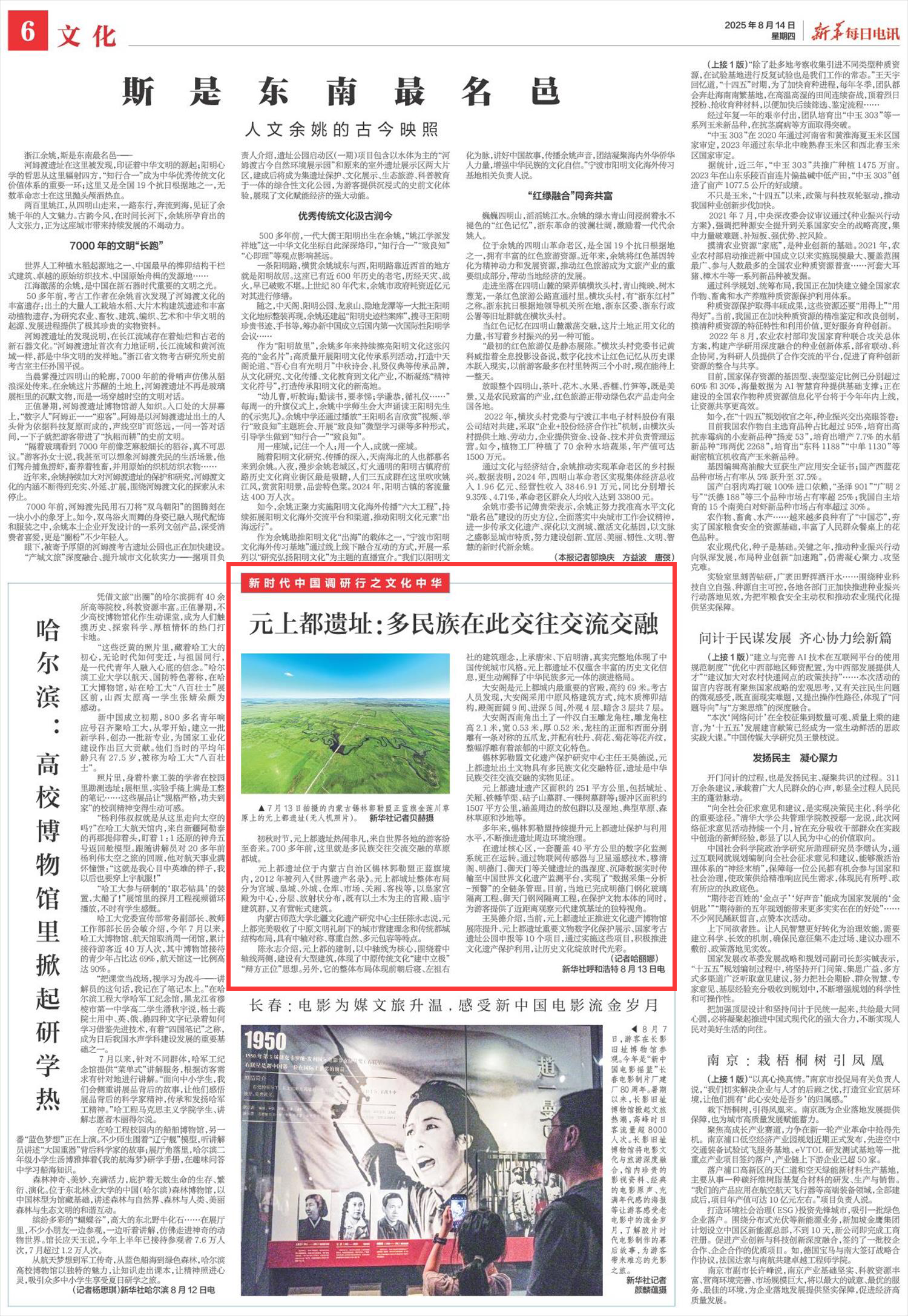 2025年8月14日,《新華每日電訊》第6版刊發(fā)題為《元上都遺址:多民族在此交往交流交融》的文章,報(bào)道了初秋時(shí)節(jié),元上都遺址熱鬧非凡,來(lái)自世界各地的游客紛至沓來(lái)。元上都遺址出土文物具有多民族文化交融特征,遺址是中華民族交往交流交融的實(shí)物見(jiàn)證。